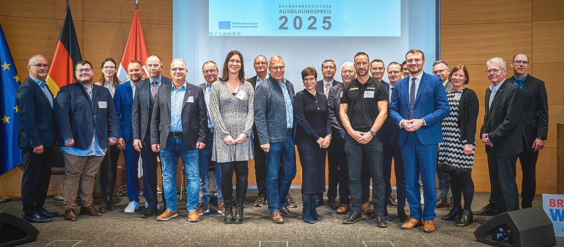 Potsdam, 5. November 2025. Heute wurden elf Unternehmen aus Brandenburg in der Staatskanzlei, unter der Schirmherrschaft von Ministerpräsident Dr. Dietmar Woidke, für ihr vorbildliches Engagement in der betrieblichen Ausbildung mit dem Brandenburgischen Ausbildungspreis gewürdigt. In Anwesenheit von Arbeitsminister Daniel Keller wurde die Auszeichnung von Vertreterinnen und Vertretern des Brandenburgischen Ausbildungskonsenses überreicht. Auf den mit je 1.000 Euro dotierten Preis hatten sich dieses Jahr 72 Unternehmen beworben.